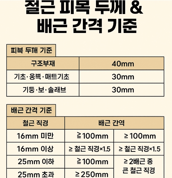 👉 즉, 슬래브에 D10 철근을 쓴다면 간격은 최소 150mm, 기둥에 D25 이상 철근을 쓴다면 최소 250mm 이상 확보해야 합니다.